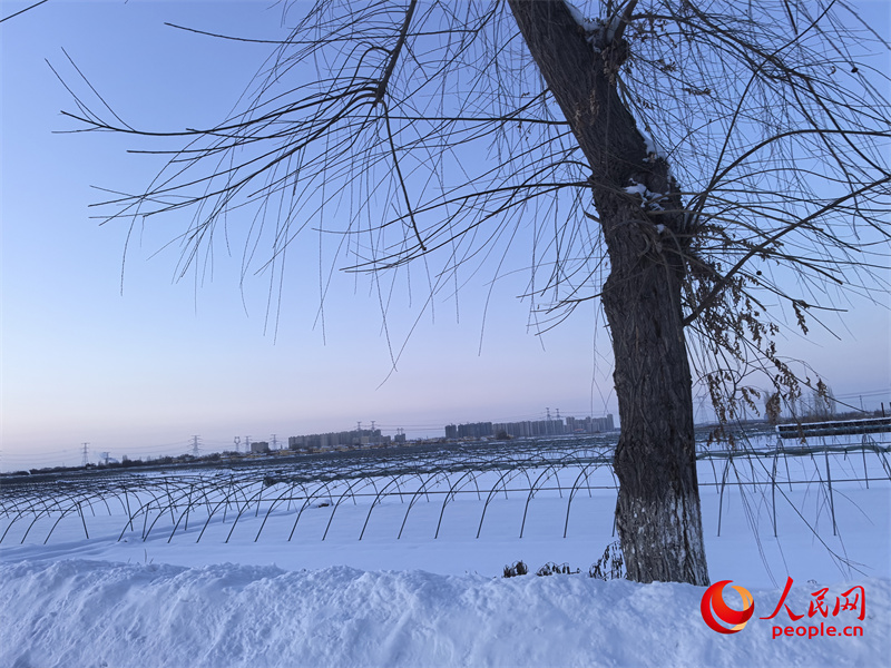 小字号天山脚下,青格达湖边,下了一天一夜的大雪刚停,刘建军就去了隔壁新联村的清洁能源智能温室育苗大棚,看看前几天育的茄子发芽了没。
