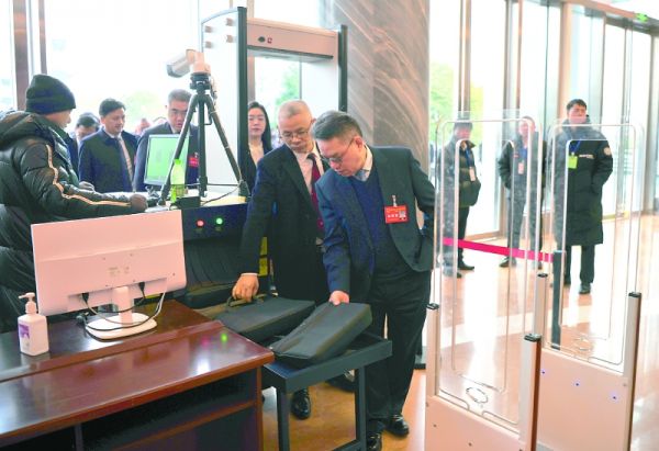 人大代表有序排队过安检参会。