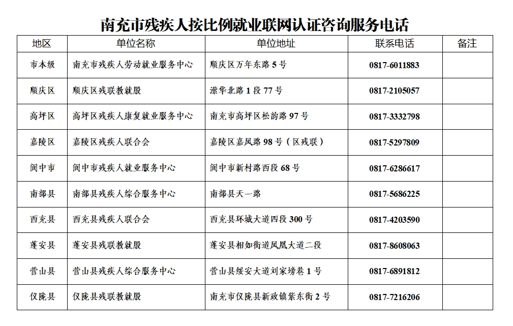 附件:南充市残疾人按比例就业联网认证咨询服务电话