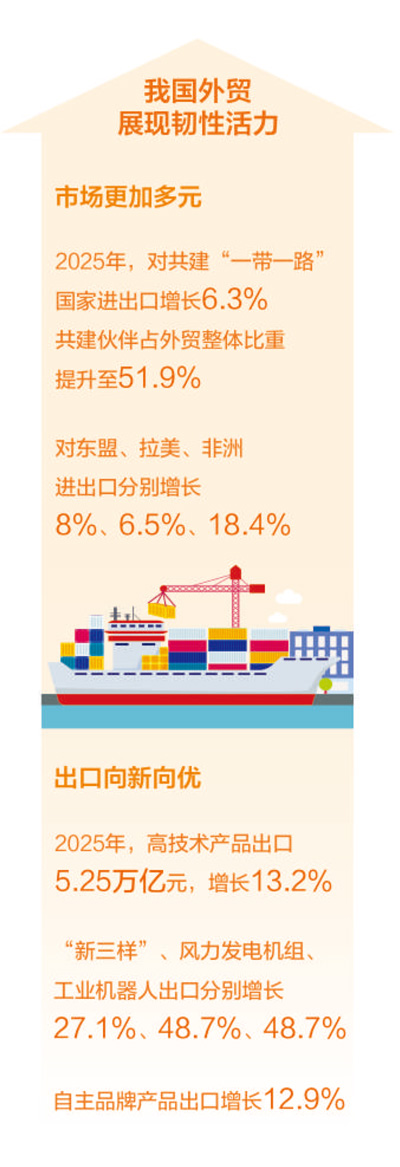 继续保持全球货物贸易第一大国地位、实现入世以来时间跨度最长的连续增长、连续17年成为全球第二大进口市场……2025年我国外贸亮点纷呈,展现出强大韧性。在全球经济增速放缓,单边主义、保护主义抬头的背景下,取得这样的成绩殊为不易。