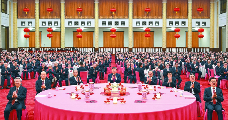 人民大会堂宴会厅灯光璀璨、喜气洋洋,各界人士2000多人欢聚一堂、共迎佳节,现场洋溢着欢乐祥和的节日气氛。