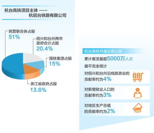 开通运营以来,杭台高铁累计客流量突破5000万人次,有效带动沿线地区经济发展。作为我国首条民营控股高铁,杭台高铁通过完善投资环境、创新投资回报机制、缩短市场培育期,为民营资本参与高铁项目投资运营发挥了积极作用。