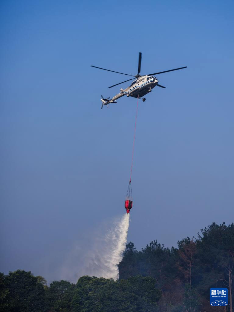 12月26日,在四川省成都市蒲江县,消防员驾驶直升机在演练现场进行吊桶洒水灭火作业。新华社发(程雪力摄)
