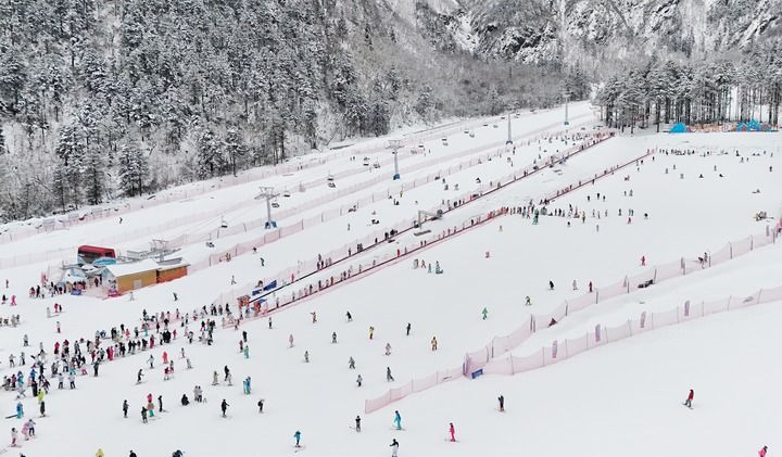 游人在四川省阿坝藏族羌族自治州汶川县羌人谷滑雪场游玩(2025年1月31日摄,无人机照片)。新华社记者 刘坤 摄