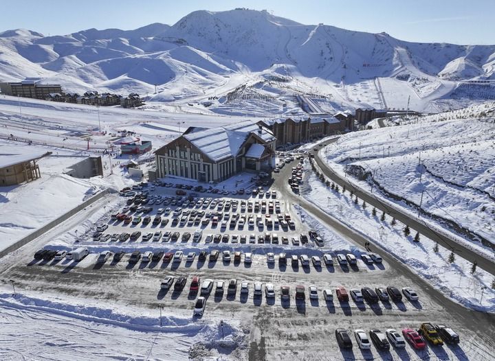 游客的车辆停在新疆阿勒泰将军山国际滑雪度假区游客服务中心旁(2025年1月24日摄,无人机照片)。新华社记者 胡虎虎 摄