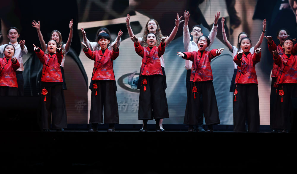 1月20日,在法国巴黎举行的“金蛇献瑞”巴黎春节联欢晚会上,中法青少年合唱《歌声与微笑》。新华社记者 高静 摄