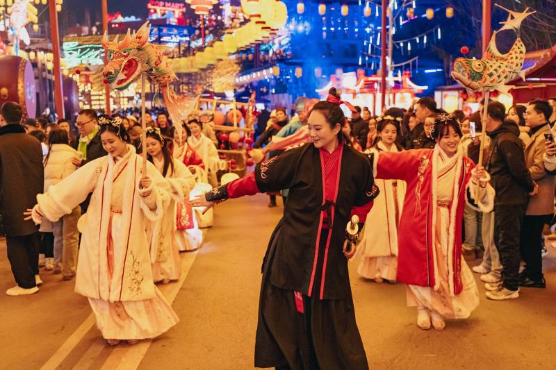 除了灯组的精彩焕新,演艺也是备足“大礼包”:4月26日至5月5日,“五一”定制无人机表演、凤凰扑翼机表演将以夜空帷幕、科技为笔,尽展空中魅影;4月26日、4月27日、4月30日至5月4日,五大主题表演在园内轮番上演——在“文明伊始”灯区,感受迎宾鼓舞的欢乐与活力;在二号广场,体验传统非遗表演的独特魅力;在“欢乐中国年”灯区欣赏“劳动之美映丰收”杂技表演;在“盐街灯市”与动漫COSER近距离互动,感受跨次元浪漫。此外,“五一节”期间,景区还将在主舞台推出“五一”主题音乐会,让游客近距离感受节日的热烈氛围。
