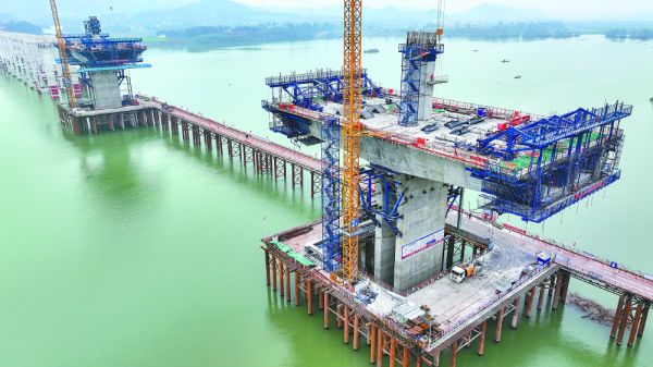 2月21 日,阆营高速公路阆中嘉陵江特大桥建设现场,工人正在进行主桥悬浇梁和主塔施工 王玉贵 摄