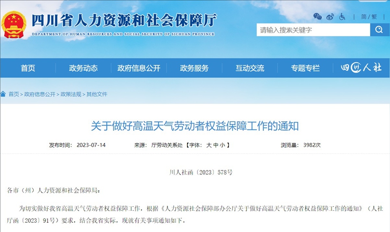 7月14日,四川省气象局发布消息,盆地阶段性高温天气持续,局地气温将达40℃以上。高温天气下,该如何保障劳动者权益?近日,四川省人力资源社会保障厅发布关于做好高温天气劳动者权益保障工作的通知,强调要充分认识高温天气对劳动者特别是环卫工人、快递员、外卖员等户外作业劳动者带来的危害,把保护劳动者生命安全摆在首位,加大工作力度,采取有效措施维护好高温天气下劳动者合法权益,全力保障劳动者生命安全和身体健康。
