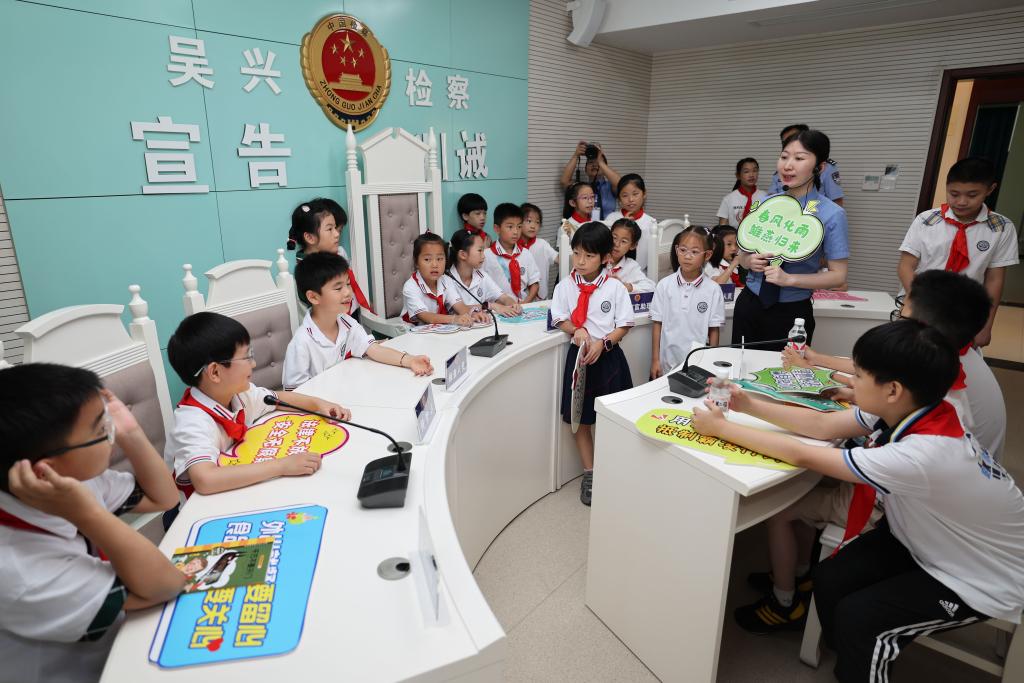 2024年7月3日,湖州市吴兴区人民检察院检察官带领小学生参观未成年人检察办案区。新华社记者 黄宗治 摄