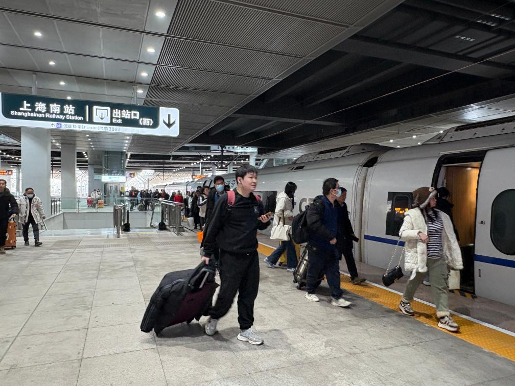 1月25日,旅客在铁路上海南站的站台上准备乘车。新华社记者 王辰阳 摄