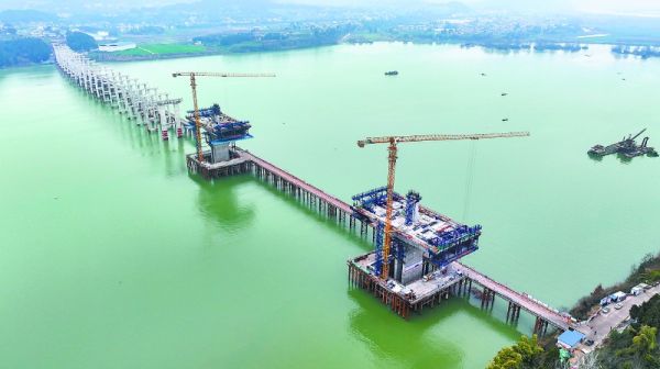 2月21日,阆中市阆(中)营(山)高速公路嘉陵江特大桥建设工地上,70多名工人正在进行主桥悬浇梁和主塔施工,现场一派热火朝天的忙碌景象。目前,该项目引桥水中墩下部结构施工全部完成,主桥完成悬浇梁6号块和主塔柱3节段施工。大桥施工整体进展过半。阆营高速公路嘉陵江特大桥是阆营高速公路的控制性工程,桥长1379米、宽32.5米,为双塔斜拉桥。(王玉贵摄)