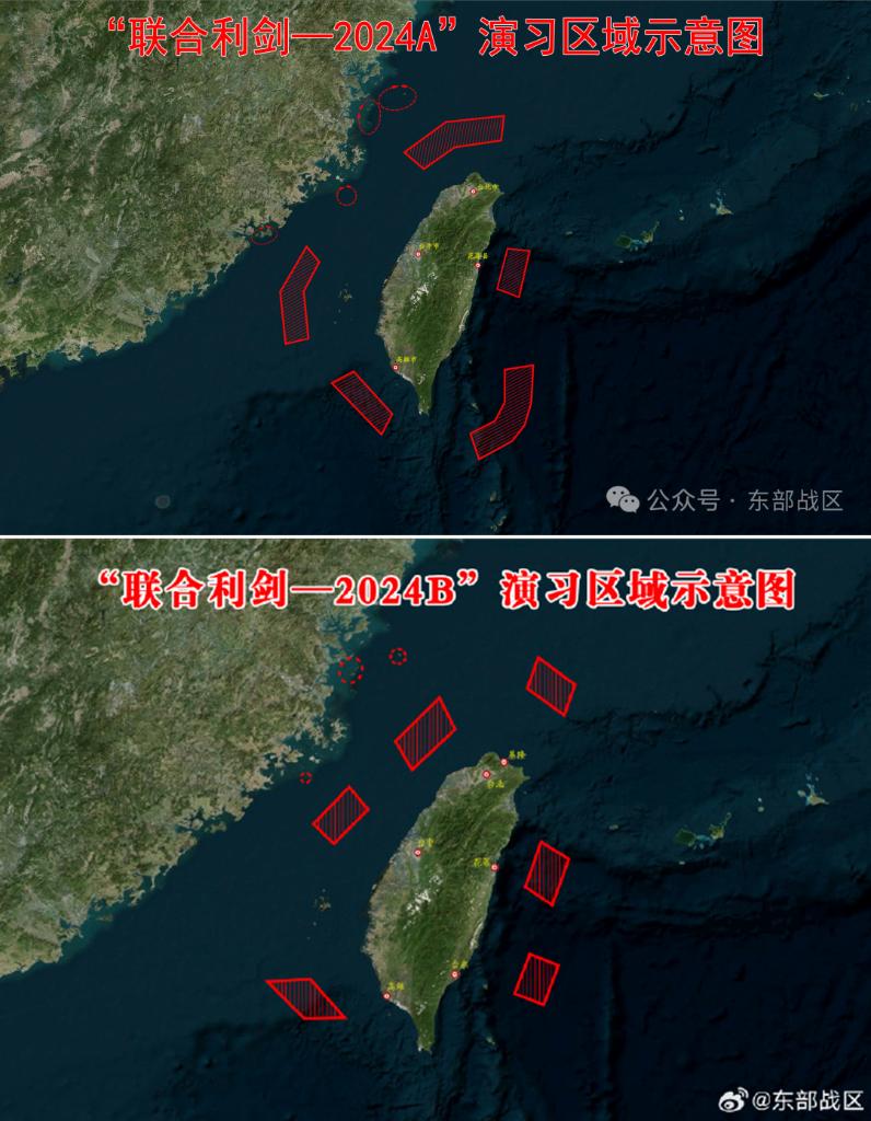 这是东部战区发布的“联合利剑—2024A”“联合利剑—2024B”演习区域示意图。 新华社发(图片来源:国防部网站)