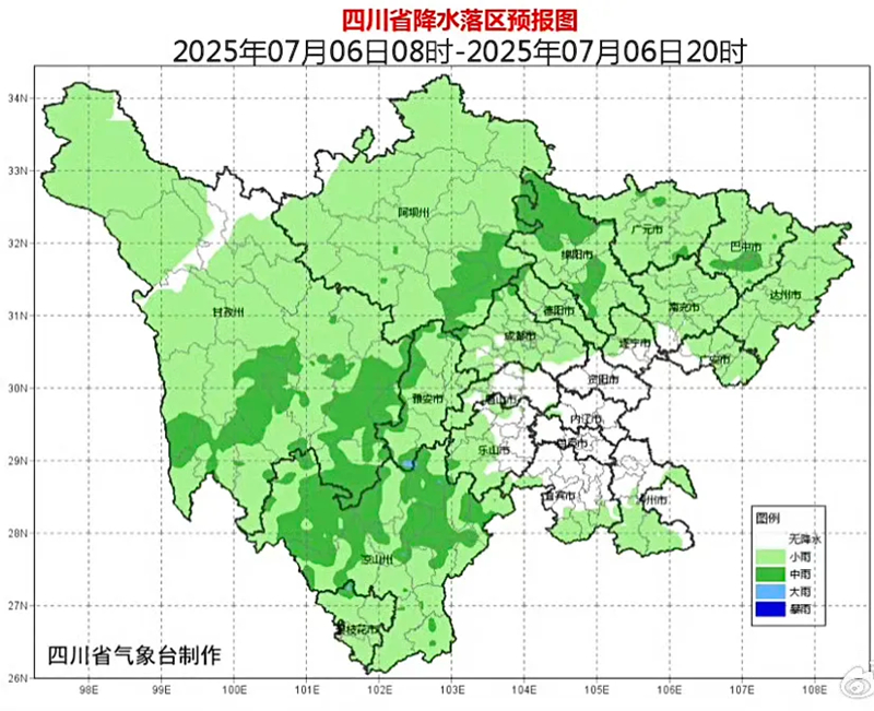 盆地西部北部阴天间多云有阵雨或雷雨,部分地方有中雨,局部大雨,盆地其余地方多云间阴有分散阵雨或雷雨;川西高原和攀西地区阴天间多云有阵雨或雷雨,部分地方有中到大雨,局部暴雨。