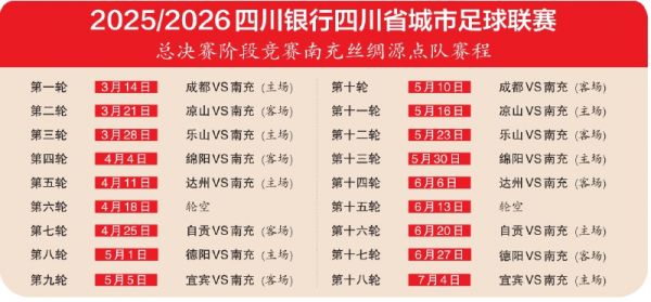 根据安排,南充丝绸源点队赛程如下:第一轮3月14日成都VS南充(主场),第二轮3月21日凉山VS南充(客场),第三轮3月28日乐山VS南充(主场),第四轮4月4日绵阳VS南充(客场),第五轮4月11日达州VS南充(主场),第六轮4月18日轮空,第七轮4月25日自贡VS南充(客场),第八轮5月1日德阳VS南充(主场),第九轮5月5日宜宾VS南充(客场),第十轮5月10日成都VS南充(客场),第十一轮5月16日凉山VS南充(主场),第十二轮5月23日乐山VS南充(客场),第十三轮5月30日绵阳VS南充(主场),第十四轮6月6日达州VS南充(客场),第十五轮6月13日轮空,第十六轮6月20日自贡VS南充(主场),第十七轮6月27日德阳VS南充(客场),第十八轮7月4日宜宾VS南充(主场)。