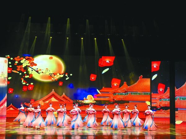 《幸福山歌》一开场,身着民族服饰的演员们载歌载舞,清脆的歌声、欢快的舞步,瞬间将喜庆氛围传递给每一位观众。随后,暖光铺展舞台,音乐表演唱《梭儿啷当梭》亮相,表演者身着乡土服饰、身背草帽,伴着“嗦儿啷当梭”的欢快衬词轻唱起舞,歌声带来乡村气息,尽显丰收喜悦。古乐悠扬,一曲古典舞《大唐夜宴》带领观众感受盛唐风华;灯光聚焦,金钱板非遗传承人用三块竹板敲出清脆节奏,一人分饰多角,将纪信的忠义故事娓娓道来;旋律萦绕,舞者们用舒展的肢体演绎舞蹈《一条大河》,用细腻的情感传递出对脚下这片土地的热爱……