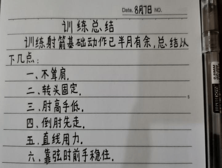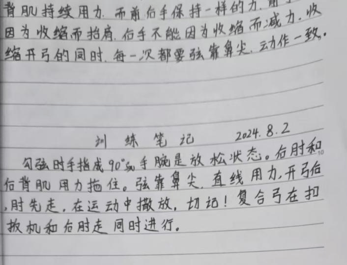 休息期间,他们观看奥运会射箭比赛,每个人对照自己的训练写心得体会,查找自己存在的问题,并每天坚持写训练日记,总结经验,不断提升。在这个过程中,他们学会了自我反思和成长。