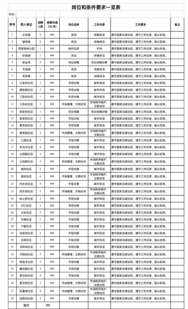 本次招聘城镇公益性岗位人员105名,具体招聘岗位及条件详见《岗位和条件要求一览表》(详见附件1)。