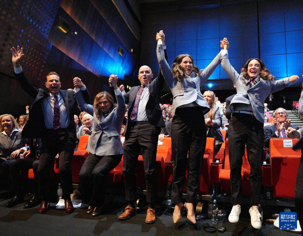 这是2024年7月24日,在巴黎进行的国际奥委会第142次全会上,美国盐湖城代表团成员庆祝获得2034年冬奥会举办权。新华社记者 孙非 摄