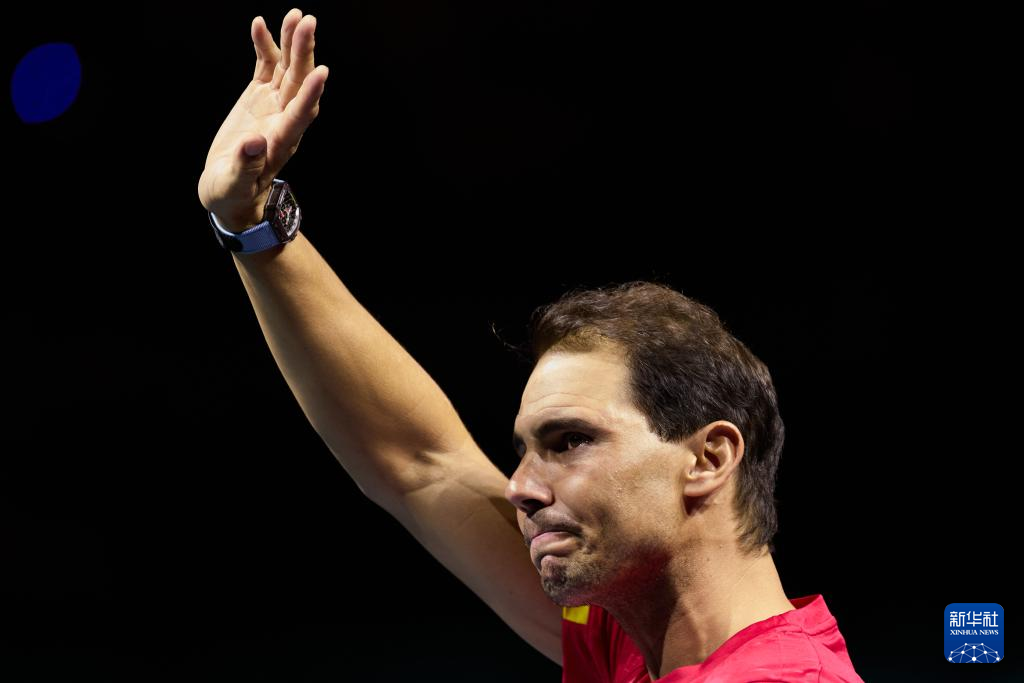 这是2024年11月20日,在西班牙马拉加举行的2024戴维斯杯男子网球团体赛四分之一决赛后,西班牙队选手纳达尔向观众致意。新华社记者 孟鼎博 摄