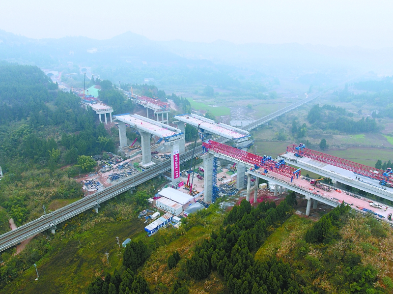 远眺成功转体后的成南高速扩容项目上跨兰渝铁路大桥。