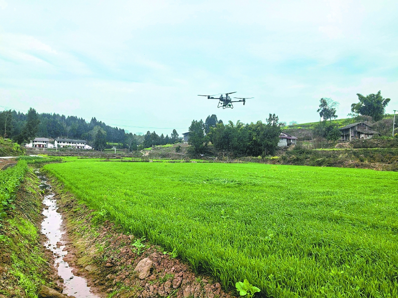 植保无人机的身影同样活跃在仪陇县双胜镇火井村的麦田里。眼下小春田管进入关键期,小麦、油菜返青及提苗工作迫在眉睫,无人机飞防让麦田病虫害防控更及时、更精准。仪陇县农业农村局农技植保中心副主任田鑫川介绍,当地已派出5支农技指导队伍分片开展工作,为夏粮丰收保驾护航。
