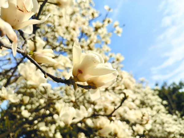 顺庆区铁欣路边雪白的玉兰花格外显眼 南充市融媒体中心记者 张瀚誉