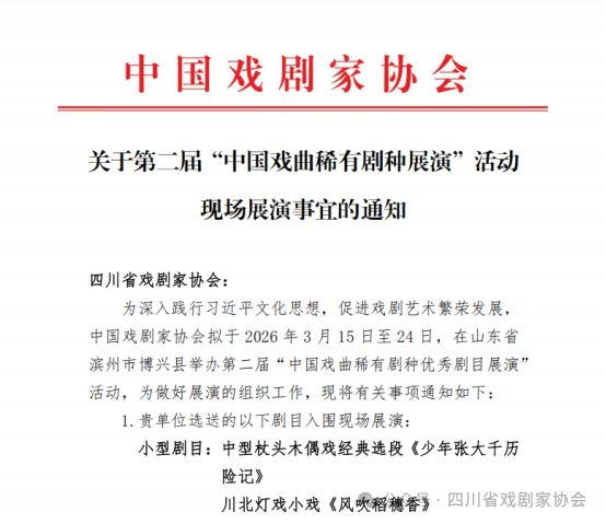 由四川省戏剧家协会选推的川北灯戏小戏《风吹稻穗香》(南充市川剧团〔川北灯戏剧团〕),成功从全国各省推荐的111部优秀剧目中脱颖而出,入选中国戏剧家协会《关于第二届“中国戏曲稀有剧种展演”活动,即将登上国家级戏曲舞台,向全国展现川北稀有戏曲的独特魅力!四川仅两部作品成功入选。