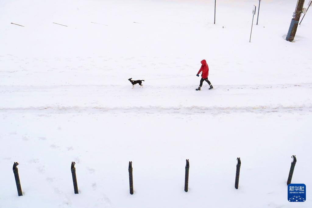 1月21日,在美国路易斯安那州新奥尔良,一名女子在暴风雪中遛狗。新华社发(魏兰摄)