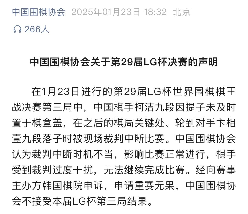 中国围棋协会随后发布声明,表示不接受第三局比赛结果。声明称:“在1月23日进行的第29届LG杯世界围棋棋王战决赛第三局中,中国棋手柯洁九段因提子未及时置于棋盒盖,在之后的棋局关键处、轮到对手卞相壹九段落子时被现场裁判中断比赛。中国围棋协会认为裁判中断时机不当,影响比赛正常进行,棋手受到裁判过度干扰,无法继续完成比赛。经向赛事主办方韩国棋院申诉,申请重赛无果,中国围棋协会不接受本届LG杯第三局结果。”