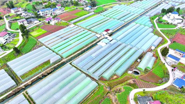 早春时节,在阆中市的蔬菜基地里,村民翻耕菜地、移栽菜苗、管护蔬菜……到处是一派忙碌景象。当地早安排、早部署,大力抓好早春蔬菜生产,切实保障市民“菜篮子”供应。图为2月10日,无人机航拍的阆中市江南街道千佛岩村蔬菜基地大棚。(王玉贵 摄)