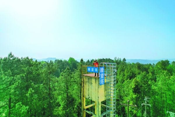 在营山县太蓬山国家森林公园,森林火情瞭望员监测森林防火情况。