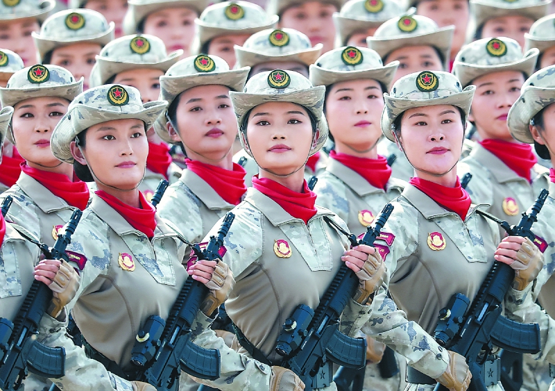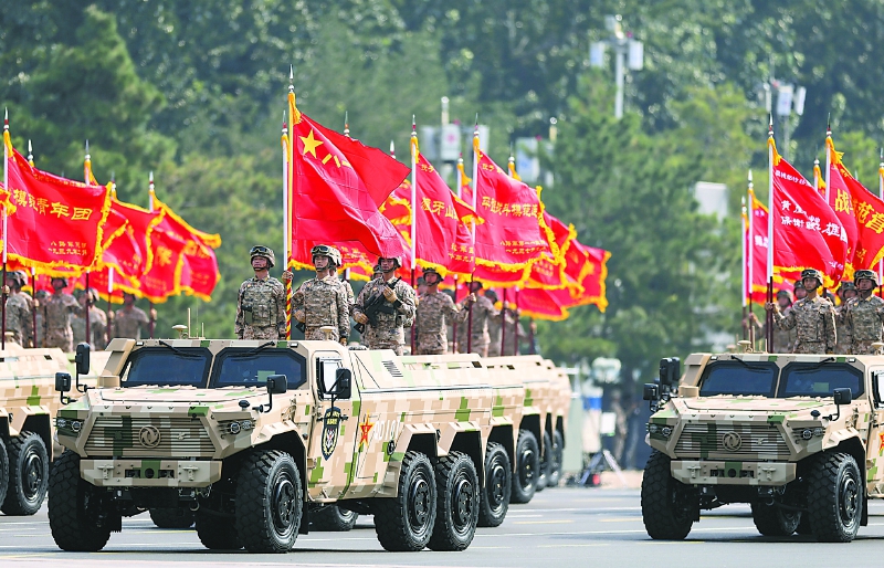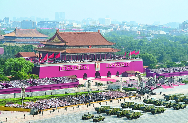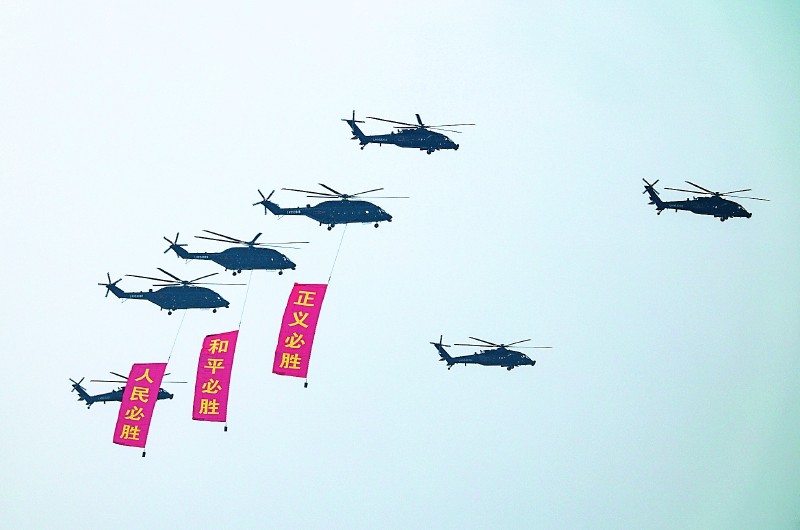 当直升机分别悬挂“正义必胜”“和平必胜”“人民必胜”的条幅飞过,当装备方队按照实战化联合编组隆隆驶来,当抗战老兵从年轻战士的脚步中听到复兴的铿锵足音……我们豪情满怀:任何艰难险阻都挡不住我们推进强国建设、民族复兴的历史进程!
