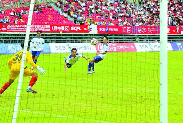 在本场比赛中,第10分钟,南充队77号陈墨禁区左路推射破门,为球队首开纪录;第17分钟,67号金铭枢接队友长传,以一记鱼跃冲顶扩大比分(如图);第55分钟,陈墨再接传中梅开二度;第77分钟,51号冉家何头球破门锁定胜局。因为南充队球员陈墨打入两球,凭借出色表现当选本场最佳球员。