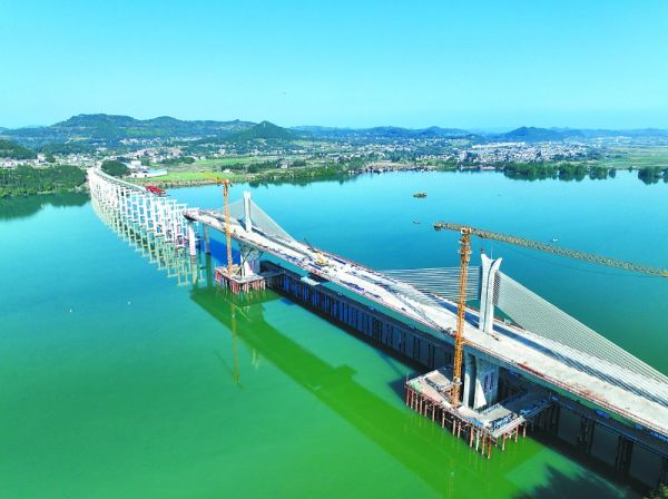 目前,大桥已完成总工程量的92%,主桥斜拉索结构已全面安装到位,桥面铺装工作正从主桥向引桥段延伸。现场可见多台黄色塔吊高耸,临时钢栈桥稳固支撑着施工平台,远处青山如黛、江水碧绿,与现代化桥梁交相辉映,构成一幅壮丽的建设图景。