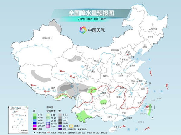 内蒙古东北部、新疆北疆东部和南疆西部山区、西藏南部和东部、青海南部、甘肃河西、川西高原中北部、云南西北部等地部分地区有小到中雪或雨夹雪。西藏南部、陕西南部、河南南部、湖北北部和西部、海南岛东北部、台湾岛东部等地部分地区有小雨。