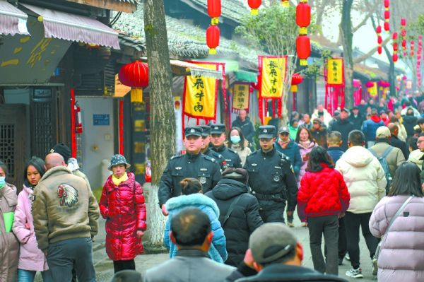 2月12日,元宵佳节,记者在阆中古城景区看到,熙熙攘攘的游客中,公安民警正在值勤值守,维持秩序,确保游客平安过节、开心过节。