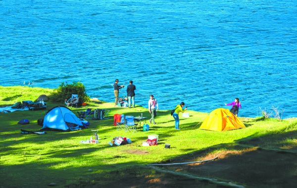 升钟湖畔,游客露营钓鱼,悠然自得。