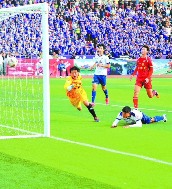 南充队鲜小龙头球破门瞬间。南充市融媒体中心记者 乐校臣 摄