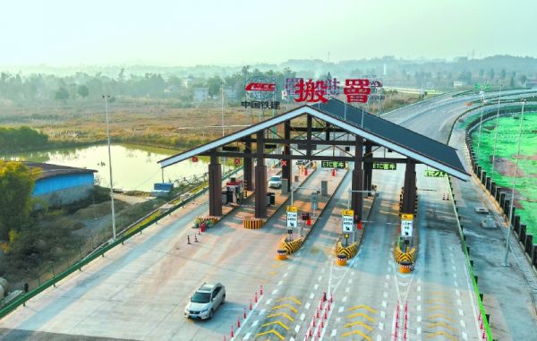 汽车从南充过境高速公路(东北段)搬罾收费站驶出。