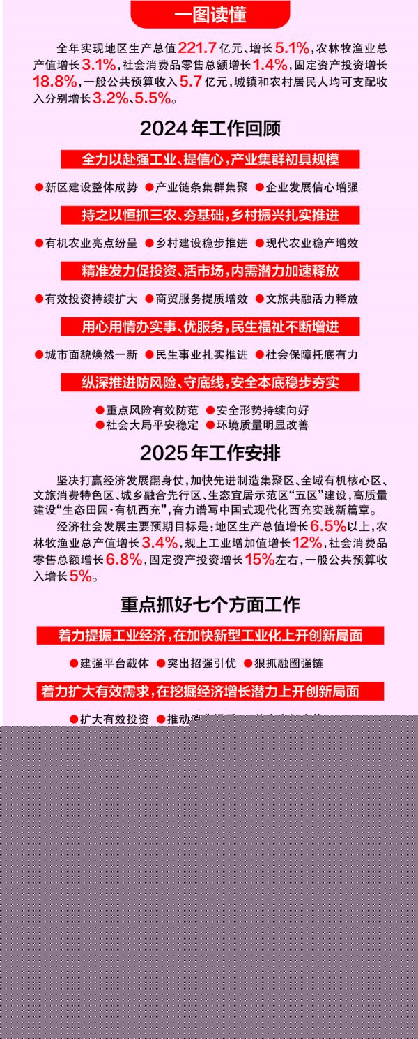 2月20日至2月24日,政协第十一届西充县委员会第四次会议、西充县第十七届人民代表大会第六次会议召开。西充县人民政府县长张洪波作《政府工作报告》,总结回顾了2024年经济社会发展各项工作,明确2025年西充将坚持稳中求进工作总基调,以“全力打赢经济发展翻身仗”为总抓手,做好“提振工业经济”等七个方面重点工作,埋头苦干,开拓进取,奋力谱写“生态田园·有机西充”建设新篇章。