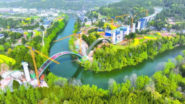 3月27日,在阆中市石滩镇境内,亭子口灌区一期工程构溪河渡槽正在加紧施工。由于渡槽横跨构溪河湿地保护区,为避免对保护区的生态造成破坏,其关键部位设计采用单跨108米的双联拱,并且在施工中采用悬拼钢拱架作为支撑体系。这是四川省水利行业首次使用的大跨度、大流量悬拼钢拱架支撑体系。目前,双联拱正在进行底模的铺设和钢筋绑扎,预计在2026年9月全部完工。