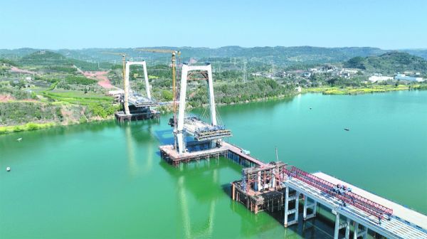 3月27日,笔者来到成南高速公路扩容工程(南充段)嘉陵江特大桥施工现场,只见一排排桥墩矗立于嘉陵江上,大桥主塔已全面封顶,工人们正在进行主梁的预应力张拉、桥面清理等工作,处处是热火朝天的建设场景。