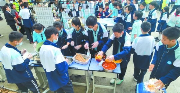 “没得时间数卖了多少钱,今天的‘生意’特别好!”七年级四班学生吴婧轩一边将一串串“钵钵鸡”交到“顾客”手上,一边收钱找零。她身边的塑料筐里,堆的零钱快冒出了筐。