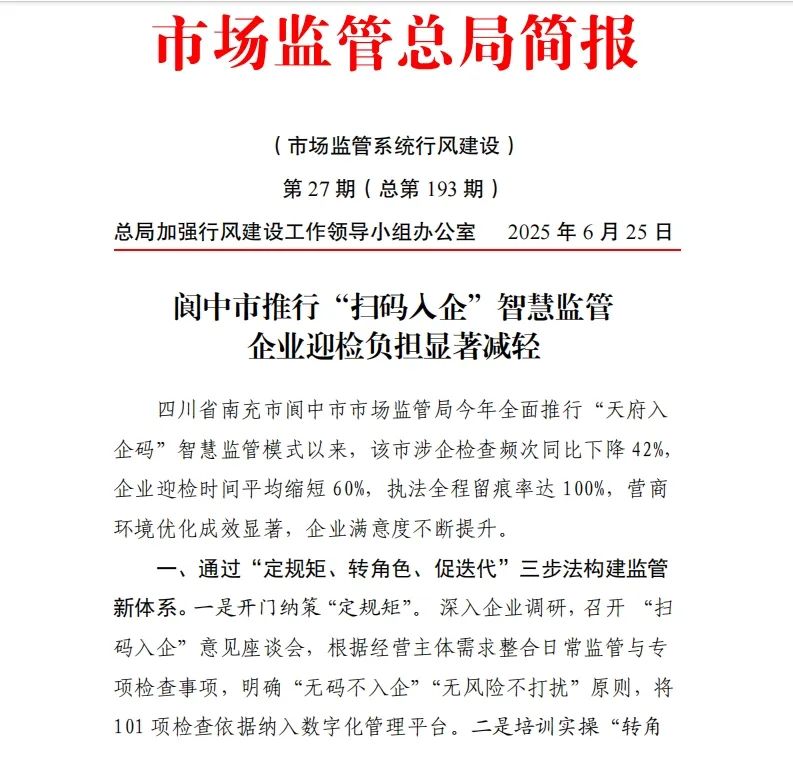 四川省南充市阆中市市场监管局今年全面推行“天府入企码”智慧监管模式以来,该市涉企检查频次同比下降42%,企业迎检时间平均缩短60%,执法全程留痕率达100%,营商环境优化成效显著。