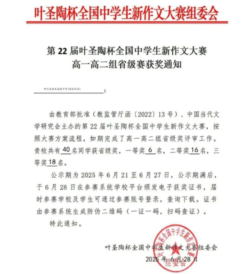 近日,两项享誉全国、极具权威性与影响力的中学生写作赛事——第十八届全国中学生创新作文大赛与第二十二届“叶圣陶杯”全国中学生新作文大赛圆满落幕。南充高中(南高)学子不负众望,凭借扎实的文学功底、独到的思想见解和灵动的文字表达,在强手如林的全国竞赛中脱颖而出,斩获多项重量级奖项,为学校争得了崇高的荣誉,充分彰显了学校在人文素养教育和创新人才培养方面的卓越成果。