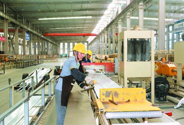 康新铝业节能新材料科技产业基地内,工人对铝型材进行加工处理。青瑞鑫 摄