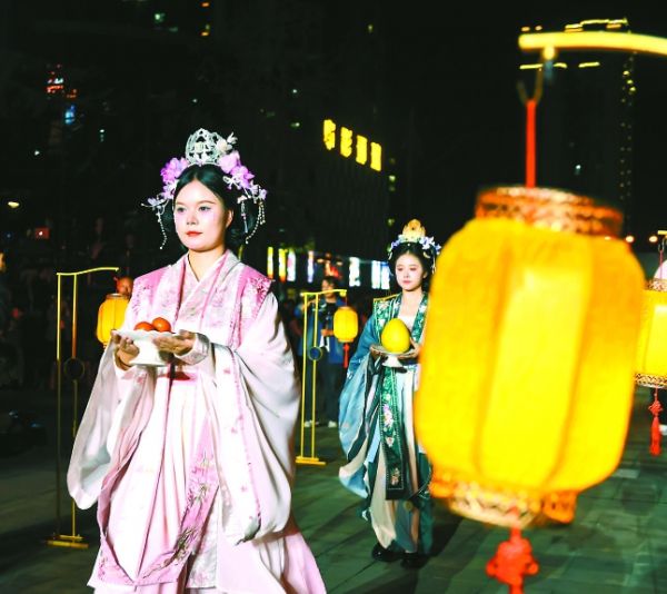 当晚7时许,巡游开始。主祭与从祭身着古装开道,孩童手提玉兔灯、月亮灯蹦跳相随,“仙女”掌宫灯引路。沿街居民纷纷提灯加入,一条“灯火长龙”沿滨江大道、宏德大道、春晖路向德园广场游走。拜月仪式开场后,主祭献果、净手、焚香,众人齐声祝祷“愿家国团圆,五谷丰登”。压轴环节,5座2米高竹编宝塔燃起火焰,演员与观众跳起汉式篝火舞,围成同心圆。