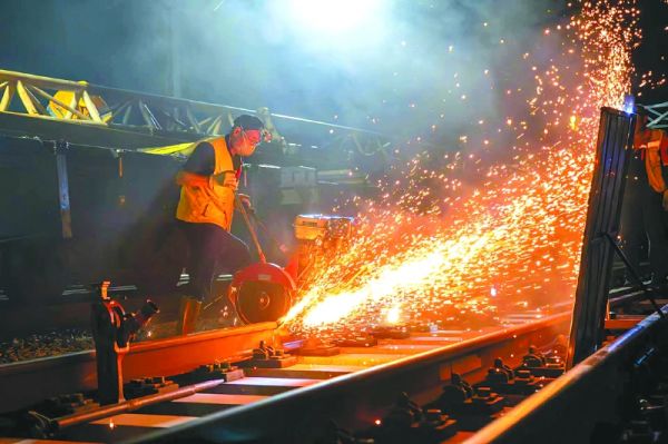 “一组松扣件,二组准备划线切割。”随着作业负责人苏杰指令下达,切轨机的咆哮瞬间撕裂夜的宁静,钢轨切割处迸射出耀眼的金色火花。随后,苏杰在作业区段前后快步奔走,额角渐渐渗出细密的汗珠。“今晚的任务,就是对前期发现异常波形的区段使用气压焊进行预防性换轨,确保线路绝对安全。”