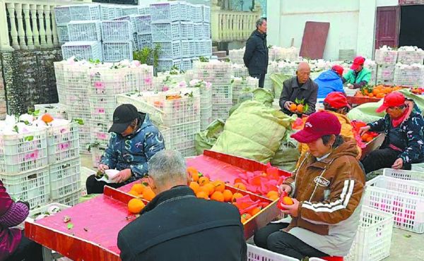 在阆中市天宫镇,果农们根据订单将采摘下的柑橘分拣打包。